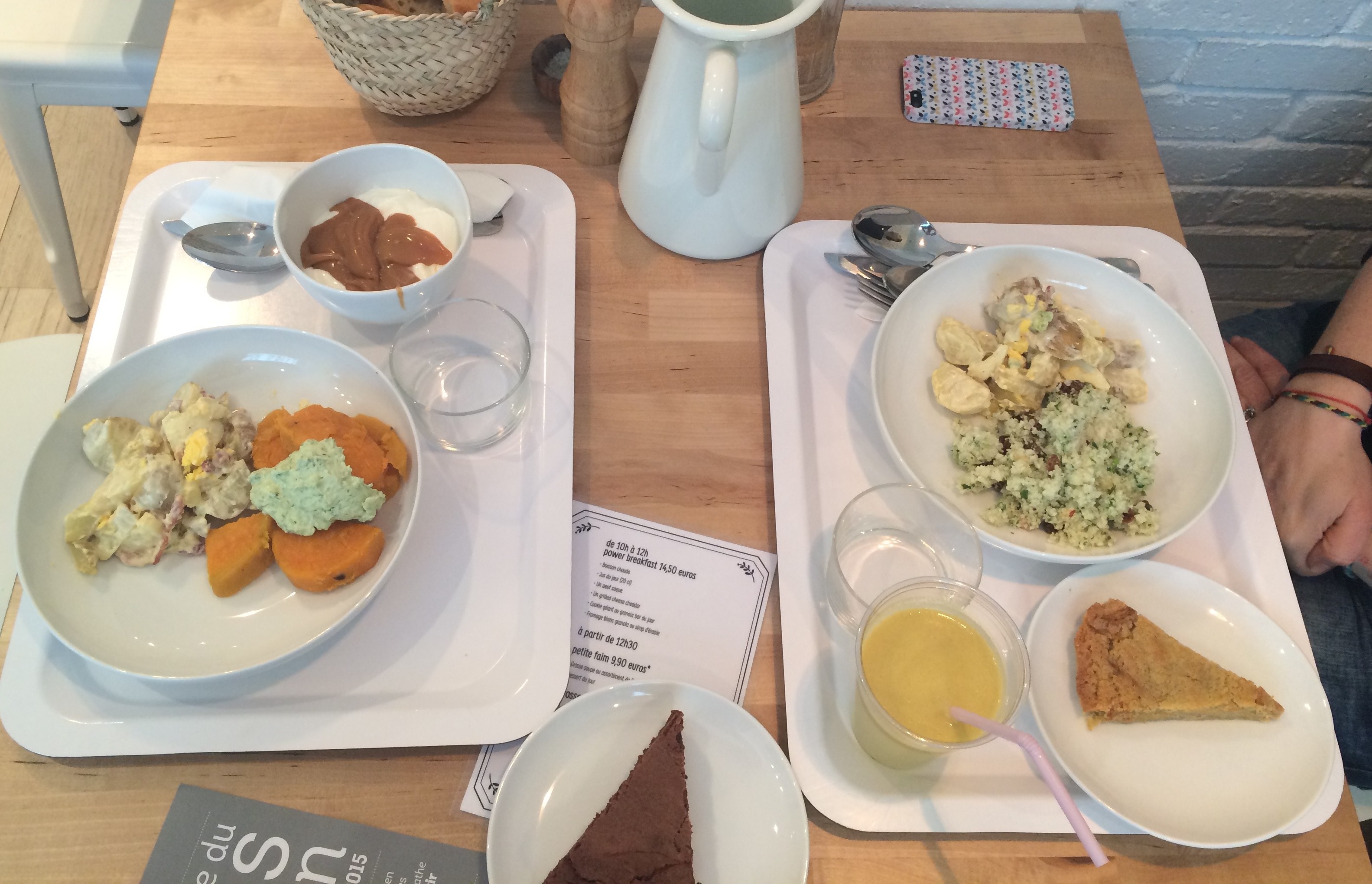 Le restaurant Maison Bastille est tout simplement parfait! La décoration est lumineuse et confortable, aéré et féminine. Le menu du jour affiché sur un grand tableau noir et l’équipe est absolument adorable. A force de demander la composition de chaque plat sans gluten, et plein de questions, j’ai fini par me présenter pour ne pas que Marie ( la créatrice et cuisinière de ce bel endroit) me prenne pour une malpolie… Alors la conversation s’est naturellement créer sur le « sans gluten » et le « bien manger ». Un bel échange d’idée et de recettes, car ici tout est fait maison. J’ai pris le menu « petite faim » à 9€90 qui m’a déjà bien remplie: une soupe de pois cassé, deux portions de salade: pomme de terre (à tomber), patate douce avec une sauce aux herbes (délicieux), avec en dessert du fromage blanc au caramel beurre salé. Aurélie, elle, a choisie la même soupe mais en salade: choux fleur aux agrumes (à tomber également) et la même salade de pomme de terre. Nous avons partagé en plus le fondant au chocolat (Ne passez pas vers Bastille sans essayer cette merveille de gâteau sans gluten!). Si vous venez à Paris, et surtout vers Bastille, prenez le temps de vous poser dans ce restaurant, pour un déjeuner, un brunch ou simplement un thé avec une part de gâteau… Franchement, moi, j’y serais volontié resté l’après-midi entière (mais le boulot m’attendait)… Je précise que si ce très agréable endroit n’est pas « certifié » sans gluten, je n’ai pas été malade du tout… Alors qu’il m’est arrivé de déjeuner dans des endroits « certifiés » et d’en resortir « bof-bof » ( je ne partage simplement pas ces adresses là). Et si vous souhaitez des idées de recettes familiales quotidiennes, voici le lien du blog d’Aurélie : Dans la cuisine d’Aurélie où je puise moi-même de nombreuses idées. Voici en photo notre visite: