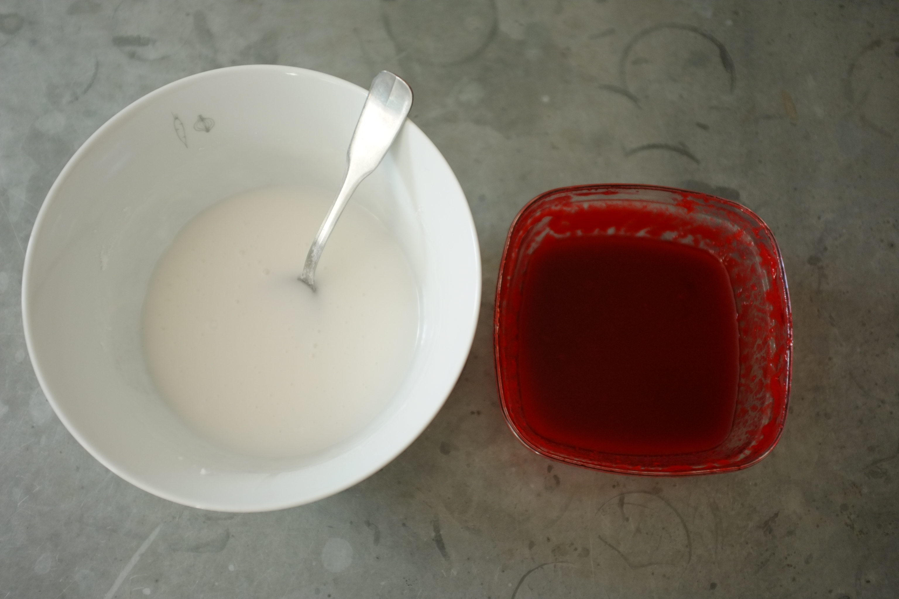 Sucre glace, colorant de framboise « maison », quelques gouttes de citron et quelques cuillères d’eau.