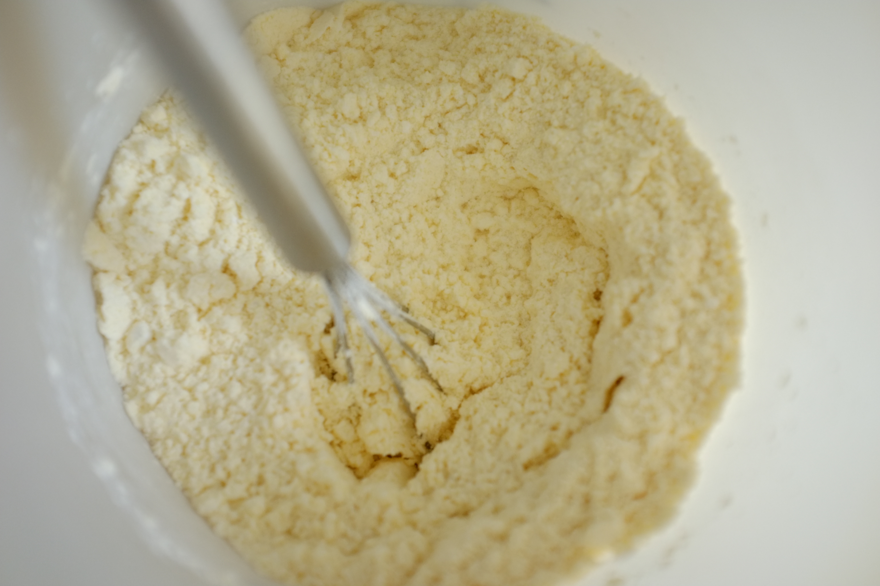 Les « ingrédients secs » sans gluten sont mélangées ensemble avant toute incorporation au reste de la recette, ici la farine de maïs apporte une belle couleur jaune pâle.