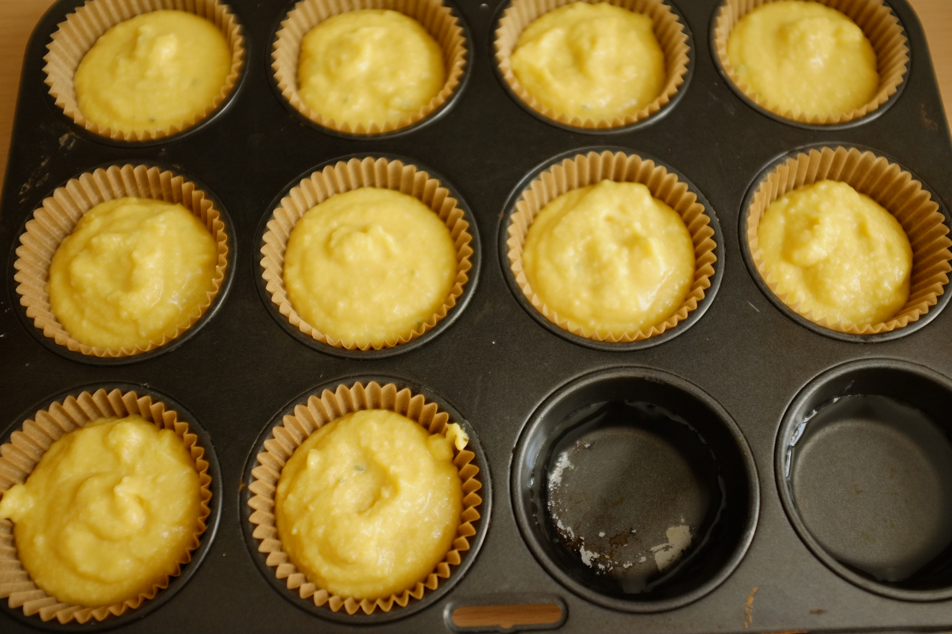 Les muffins sans gluten aux maïs et cheddar avant d’être enfournés ( dans les petites alvéoles sans muffin, je mets de l’eau pour que la cuisson soit homogène)