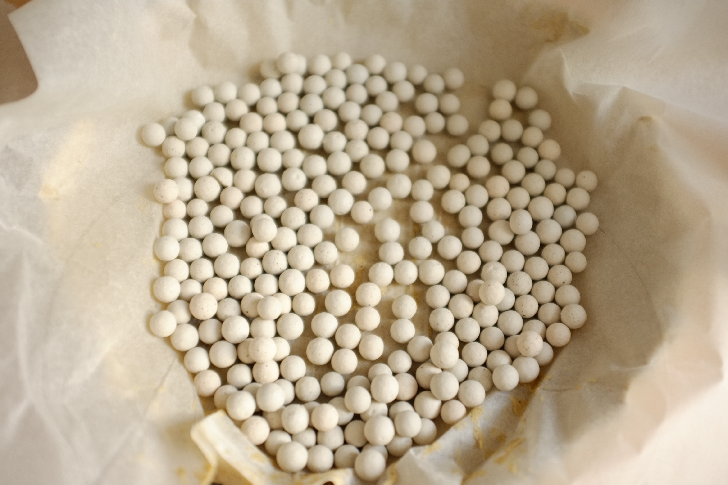 - Déposer la pâte dans le moule en verre beurré, piquer la pâte à la fourchette. Déposer dessus une feuille de papier cuisson et des billes de cuisson pour la précuire 15mn.