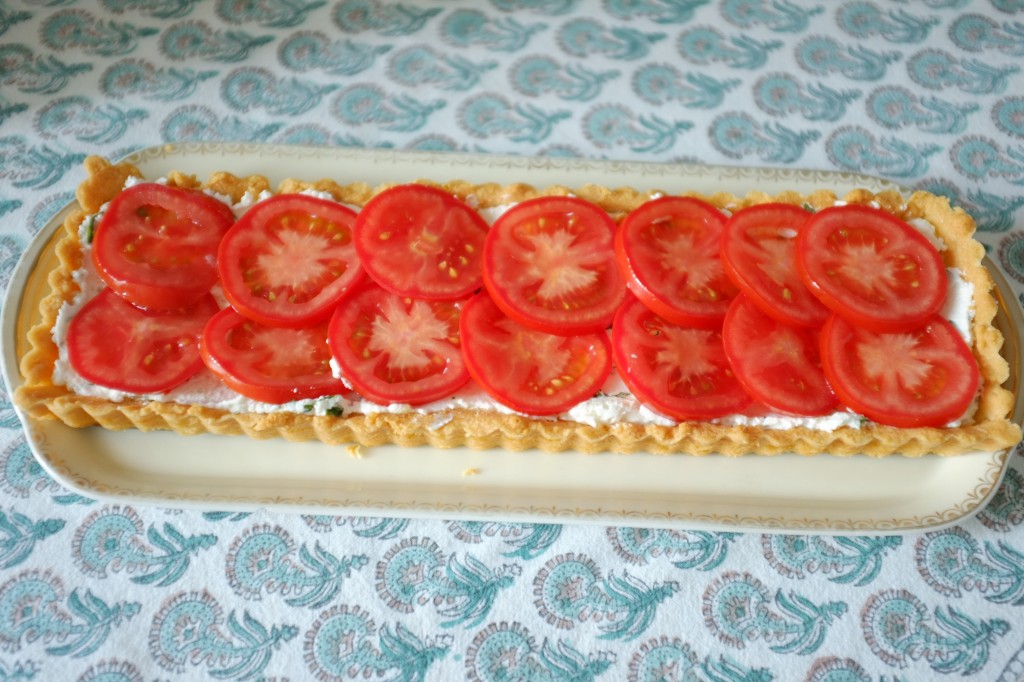 - Remplir la tarte du mélange de chèvre frais, puis recouvrir de rondelles de tomates.