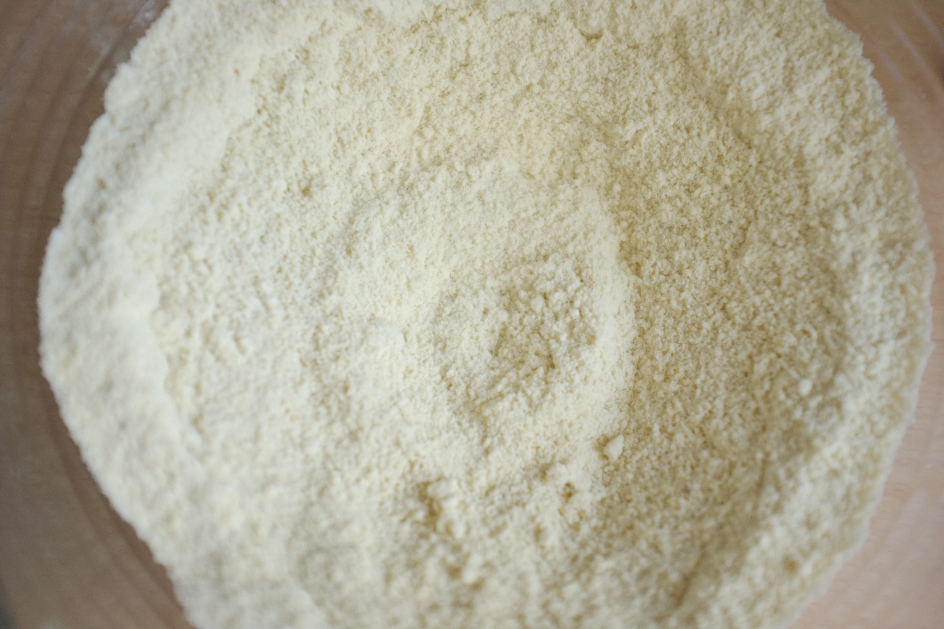 - Dans un bol, mélanger les « ingrédients secs » : farines, poudre d’amande, fécule, gomme xanthane, sel. Bien mélanger. Ajouter le sucre, bien mélanger à nouveau. (j’utilise un petit fouet à vinaigrette).