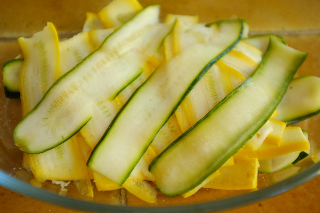 - Couper 1 courgette jaune et 1 courgette verte en très fines lamelles, à l’aide d’un économe ou d’une mandoline.