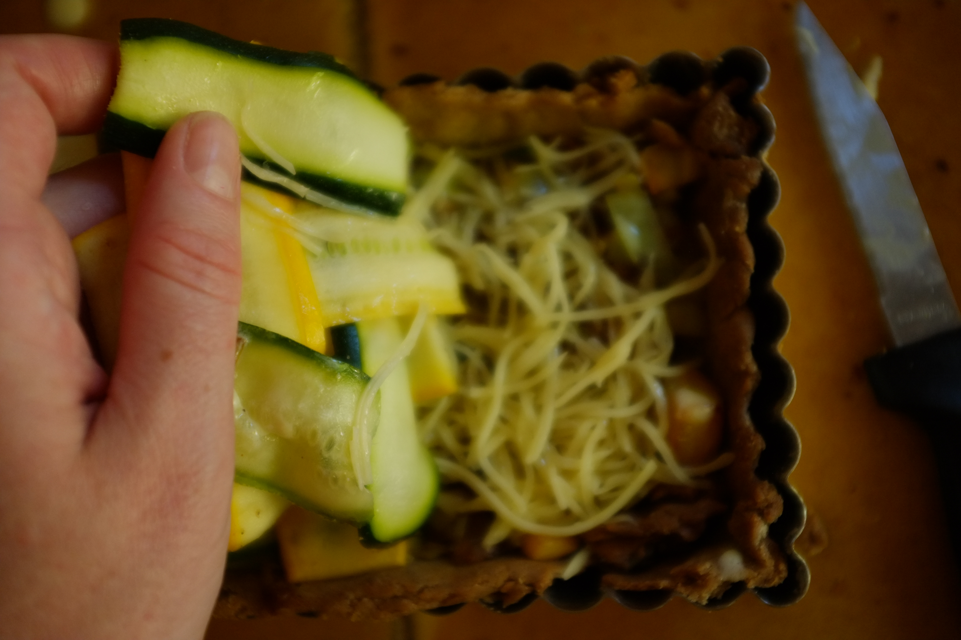 - Délicatement, soulever les lamelles de courgettes tressées et verser le mélanger d’œuf et crème jusqu’à ce que le mélange recouvre tout le gruyère.