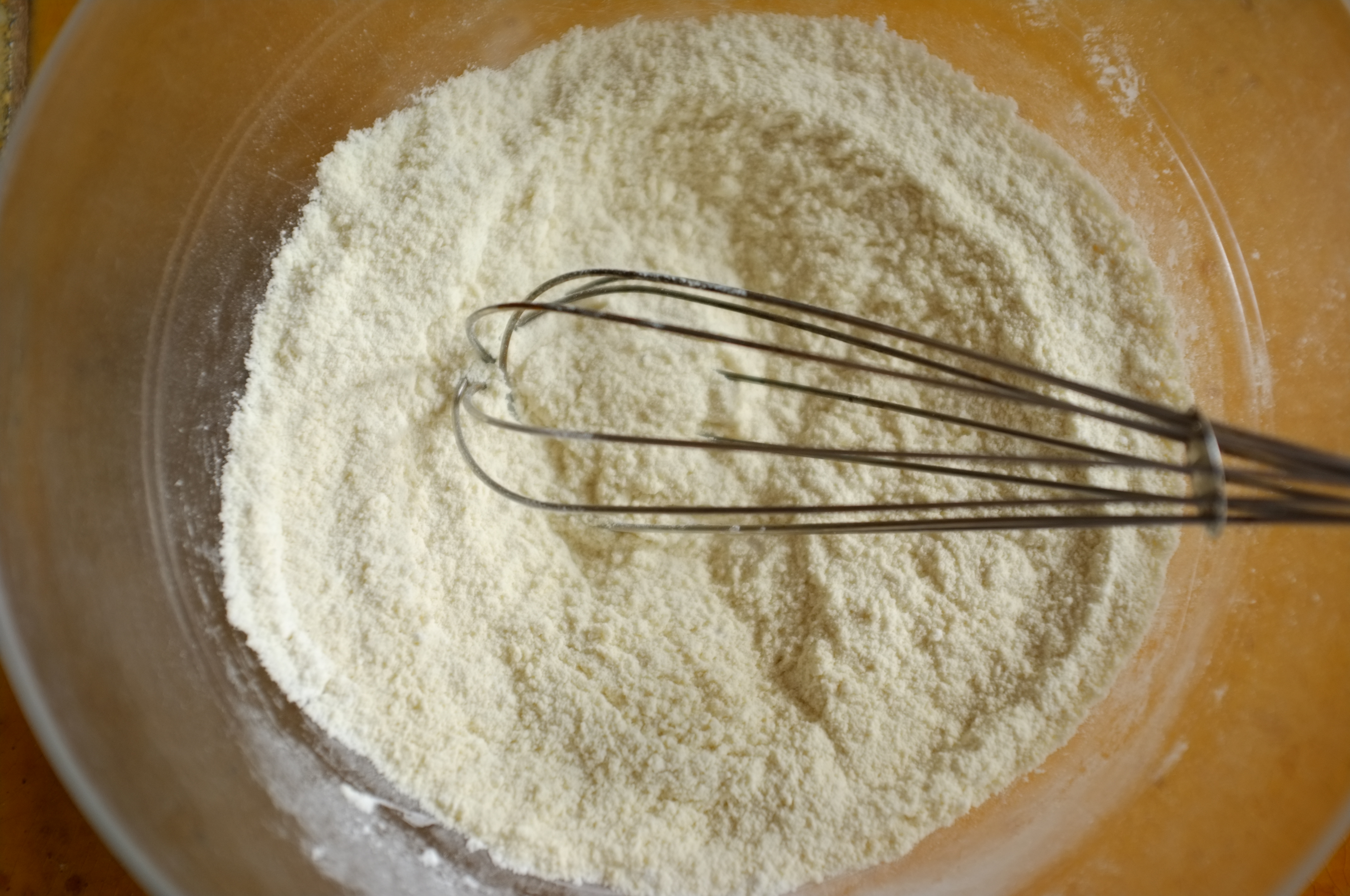 - Dans un bol, mélanger ensemble les « ingrédients secs » : farine, 40g de poudre d’amande, fécule, gomme xanthan, sucre et sel. Bien mélanger ensemble à l’aide d’un fouet et verser dans le bol du blender (ou mixeur à lame acier).