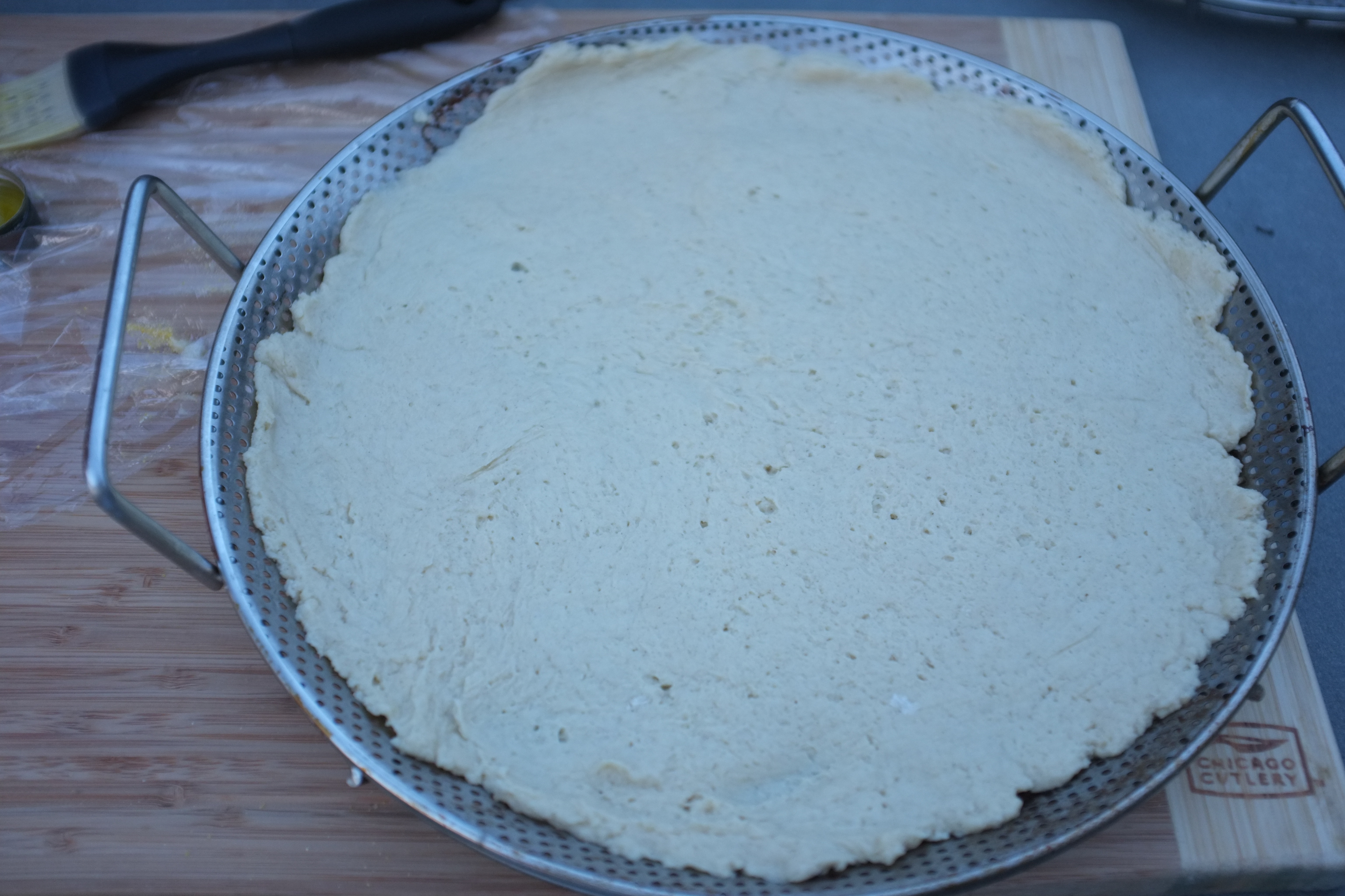 - Etaler la pâte dans le moule à pizza, comme elle est très collante, j’utilise un film plastique pour m’aider à l’étaler en une couche fine.