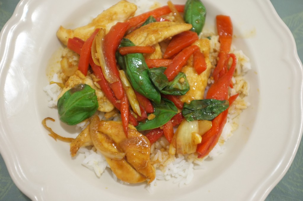 - ingrédients pour la recette sans gluten de poulet sauté au basilic et aux poivrons